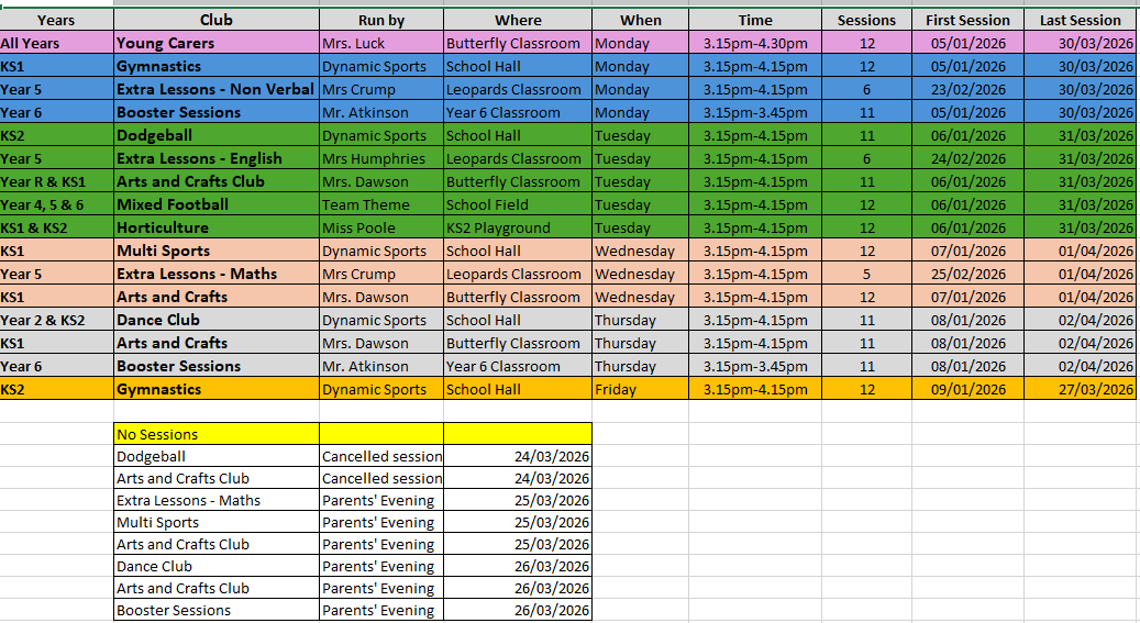 Clubs across the year include: Arts and crafts, multi-skills, boys and girls football clubs, gymnastics, Gardening Club, Young Voices choir club, dodgeball club, extra-lessons in English, Maths and thinking skills - and lots more besides!