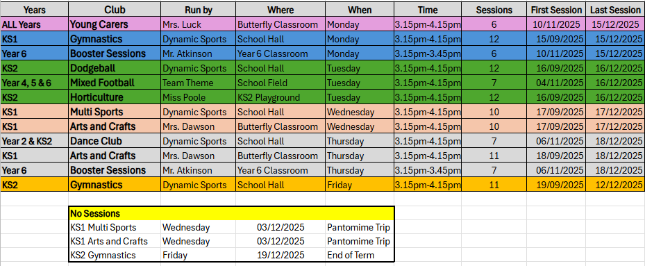 Below is a list of our clubs booked in for Terms 1 & 2, September 2025: