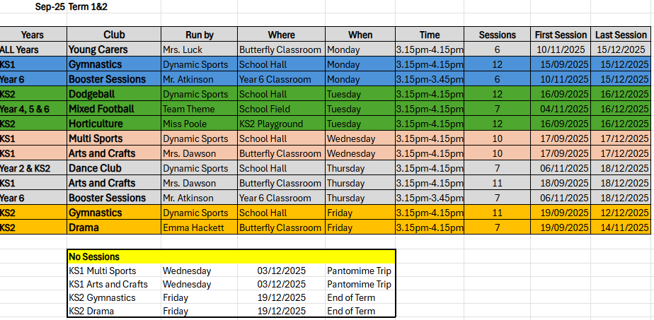 Below is a list of our clubs booked in for Terms 1 & 2, September 2025: